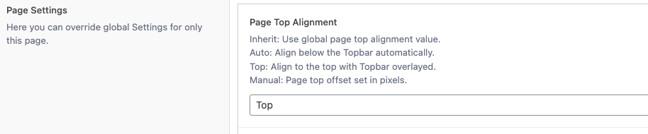 Secondly, at the global level in customizer, or in the Page’s settings, you’ll want to set the Page Top Alignment to “Top”. “Auto” will make the page content go directly below the topbar… which is desirable in pretty much every case except when we want the page content to go below/behind the topbar.