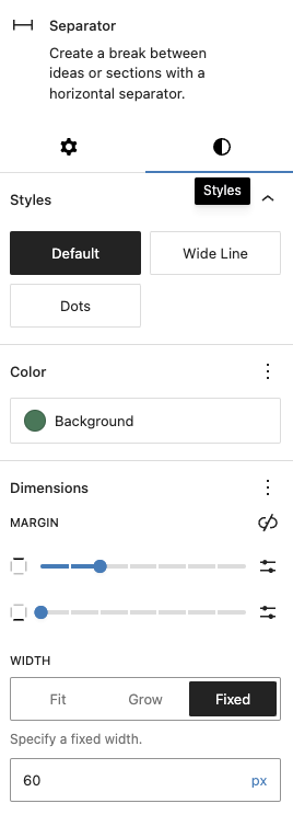 There were many ways to handle the little accent line after the Headings, and I think I’ve come up with a good one. It is very flexible, and very customizable, but it does need a few steps to set it up. To do so, I have taken over the Separator block that is in-built to WordPress.
