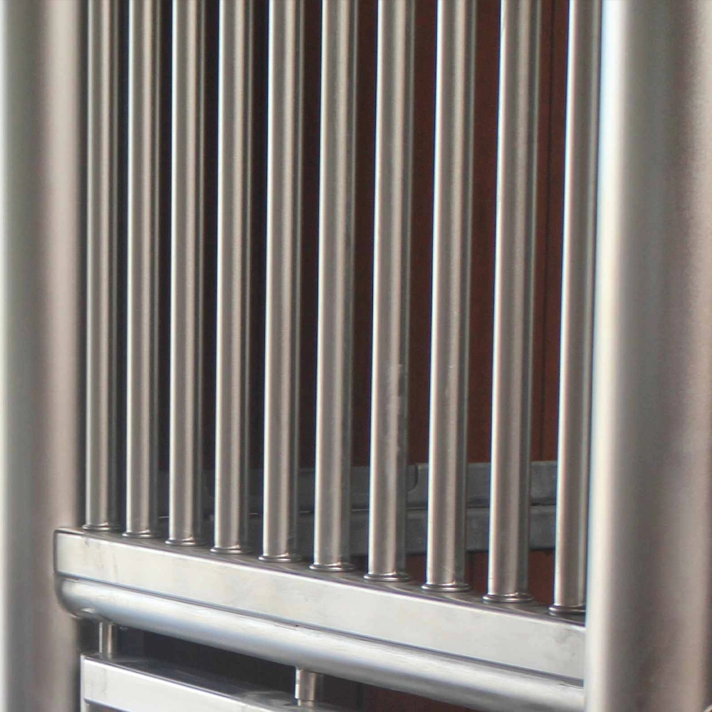 - 26.9mm bars, 10-100 cm high with 50mm gaps, connected to the frame with the “Laake-compression-press-technique” (without welds)