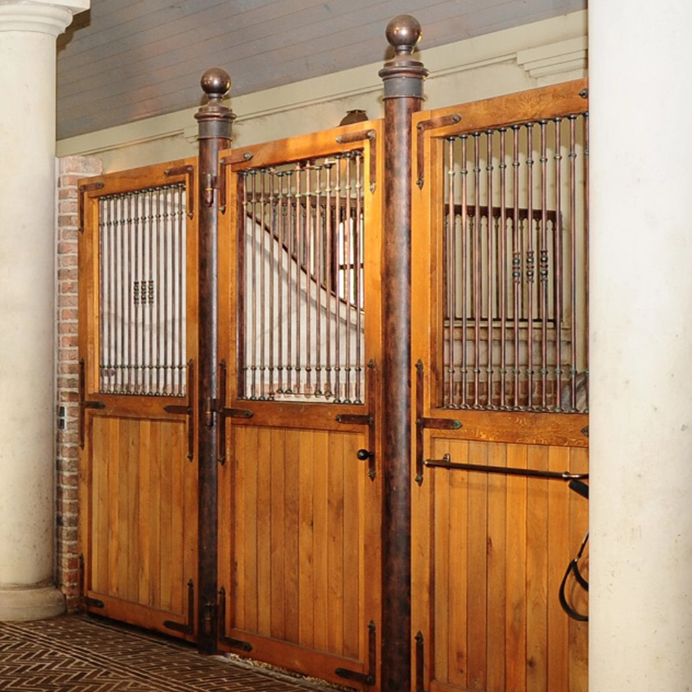 The Gut Einhaus traditional stall front with hinged door combines a robust steel frame with durable timber infill and solid iron bars, ensuring exceptional strength and longevity, even under intensive use. Designed for modern equestrian facilities seeking exclusive, premium-grade equipment, it offers refined, understated aesthetics.